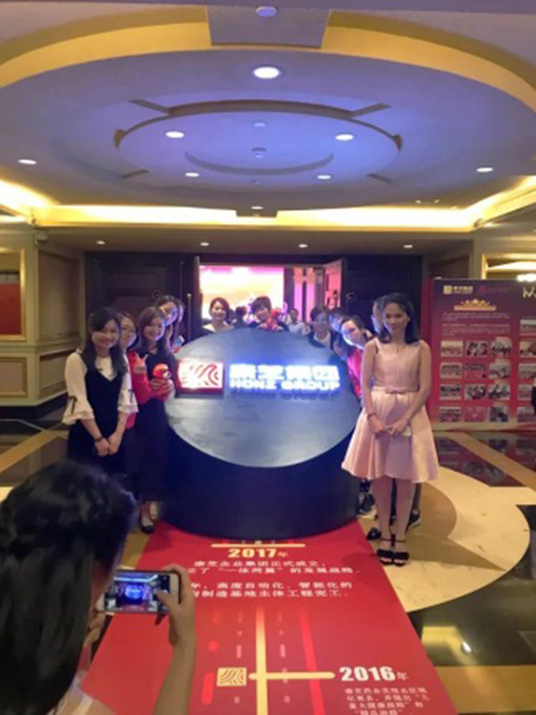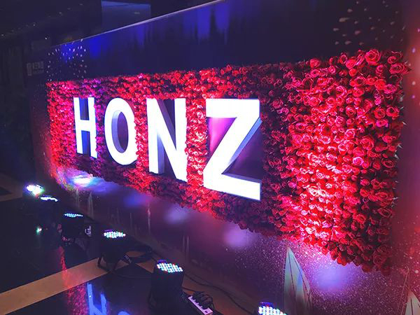 晚会景墙,鲜花群放,HONZ环绕其中,喜气洋溢,欢迎八方来宾。