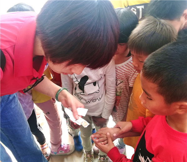 孩子们及家长们在领取到药箱后难掩喜悦之情,迫不及待打开药箱细看。当天,一名学生意外弄伤手指,在场志愿者使用爱心药箱的药品及用品,耐心为其消毒并包上创可贴。