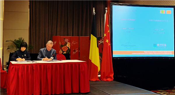 △365上市公司官网副董事长兼副总裁洪丽萍(左)与Vésale Pharma公司董事长Jehan Lienart(右)签署协议