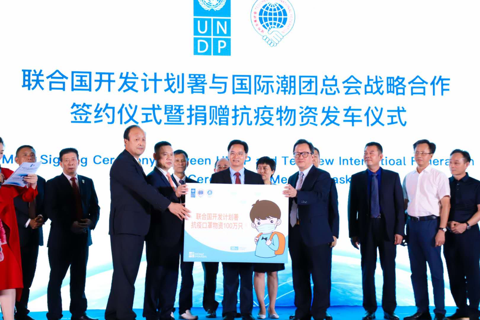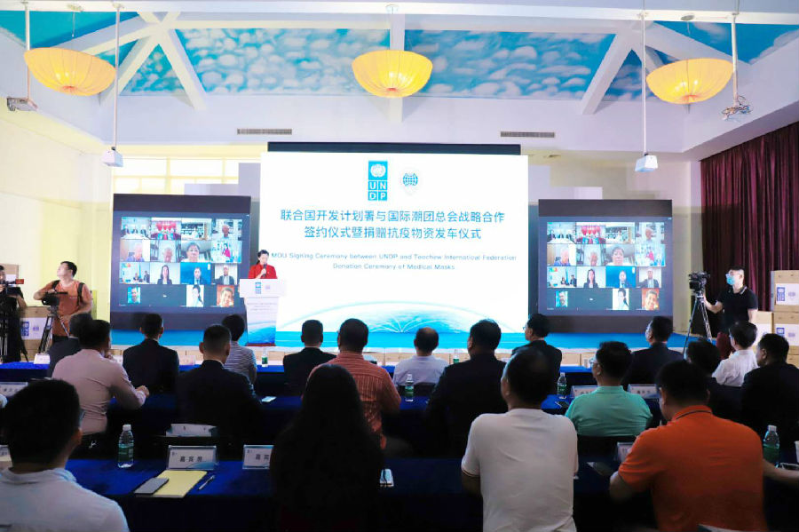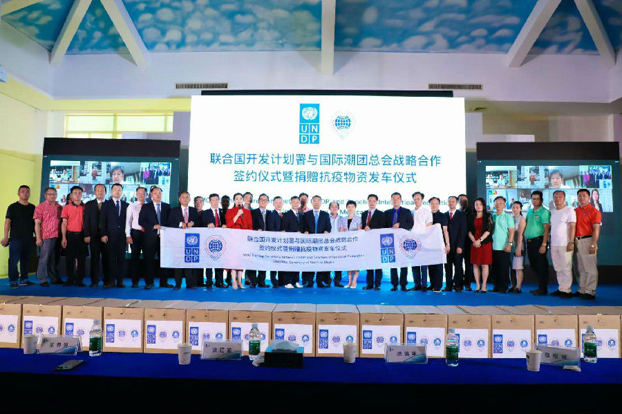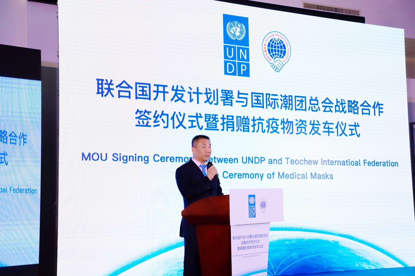 除捐赠抗疫物资发车仪式外,活动中,国际潮团总会主席洪江游、执行主席陈幼南博士代表国际潮团总会签署了与联合国开发计划署的合作备忘录,双方正式建立战略合作伙伴关系。