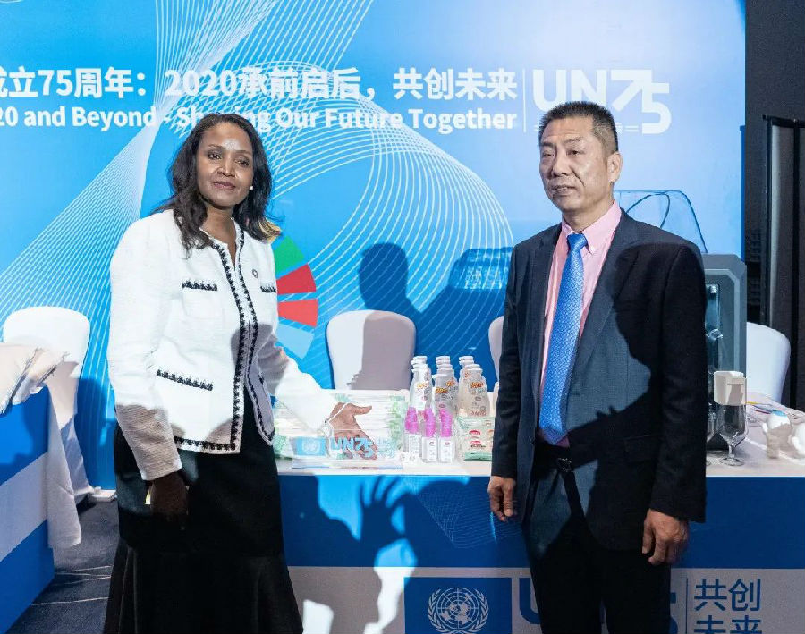 (图为联合国代理驻华协调员桑爱玲女士与365上市公司官网董事长洪江游先生 )