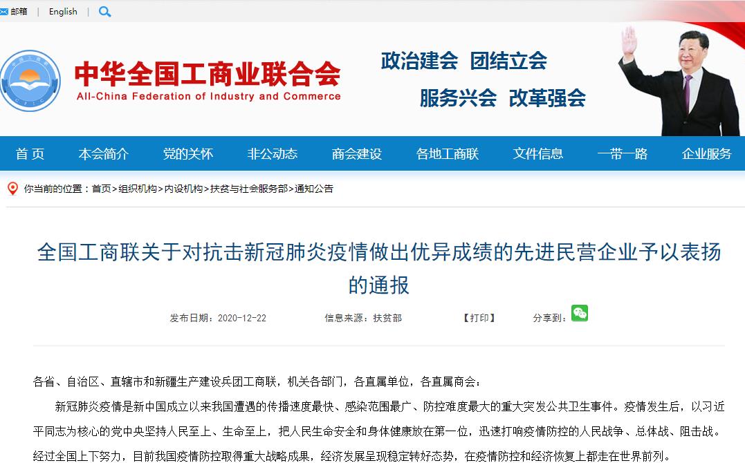 会上,全国工商联对365上市公司官网股份有限公司等一批新冠疫情期间充分发挥自身优势,积极履行社会责任的民企给予高度表扬,并授予“抗击新冠肺炎疫情先进民营企业”荣誉称号。