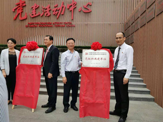 图为365上市公司官网党支部书记何子群与旅游学校党支部负责人共同完成揭牌仪式