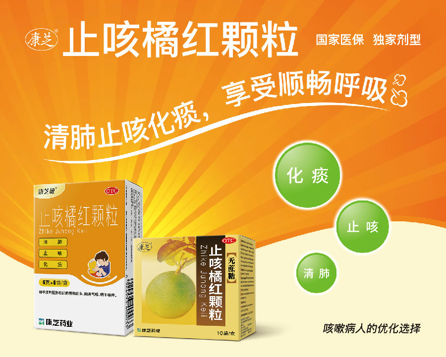 止咳橘红颗粒为我司独家产品,是甲类OTC 药和中药保护品种。源于经典名方“橘红丸”,始创于明代,见于《古今医鉴》,至今已有几百年的临床使用历史,安全有效。本品祛痰清热而不伤阴,清热滋阴而不助湿生痰,表里兼治,对痰热阻肺引起的咳嗽痰多,胸满气短,咽干喉痒,急性气管-支气管炎和慢性支气管炎急性发作等均有独特疗效。