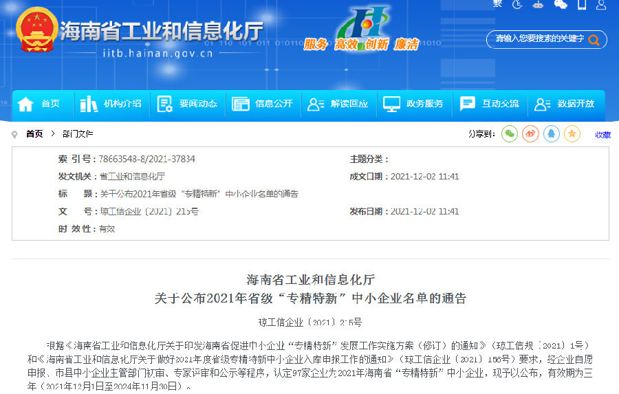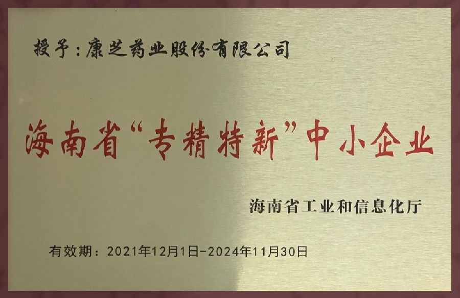 近日,海南省工业和信息化厅正式公布2021年省级“专精特新”中小企业名单。其中,365上市公司官网股份有限公司作为海南省首家创业板儿童大健康上市药企顺利入围。