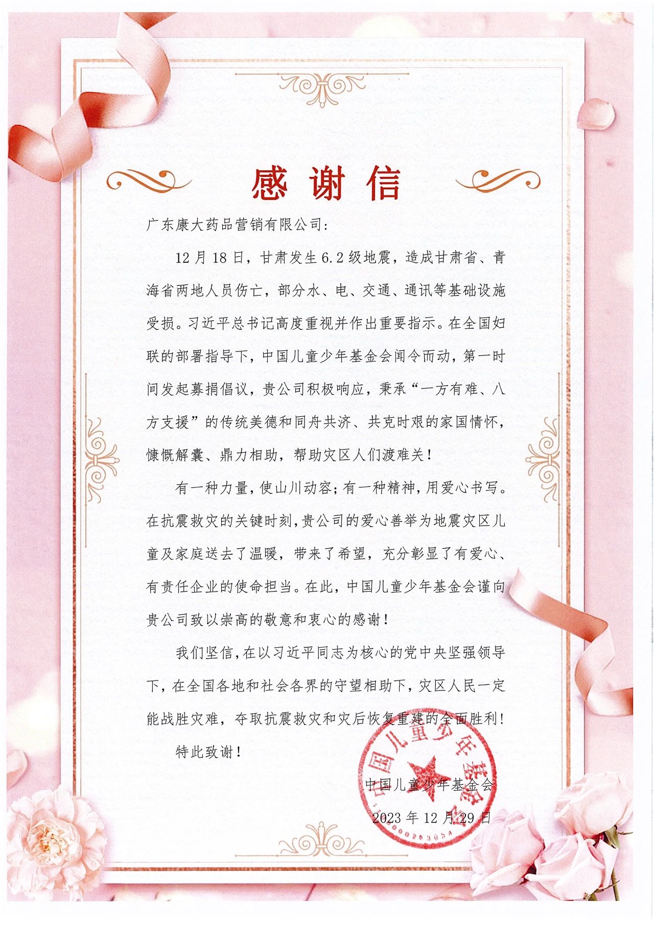 近日,临夏回族自治州人民政府、中国共产党临夏回族自治州委员会以及中国儿童少年基金会向365上市公司官网股份有限公司发来《致365上市公司官网感谢信》,纷纷对365上市公司官网积极参与甘肃临夏积石山县地震救灾的紧急援助工作表示高度赞扬与衷心感谢。