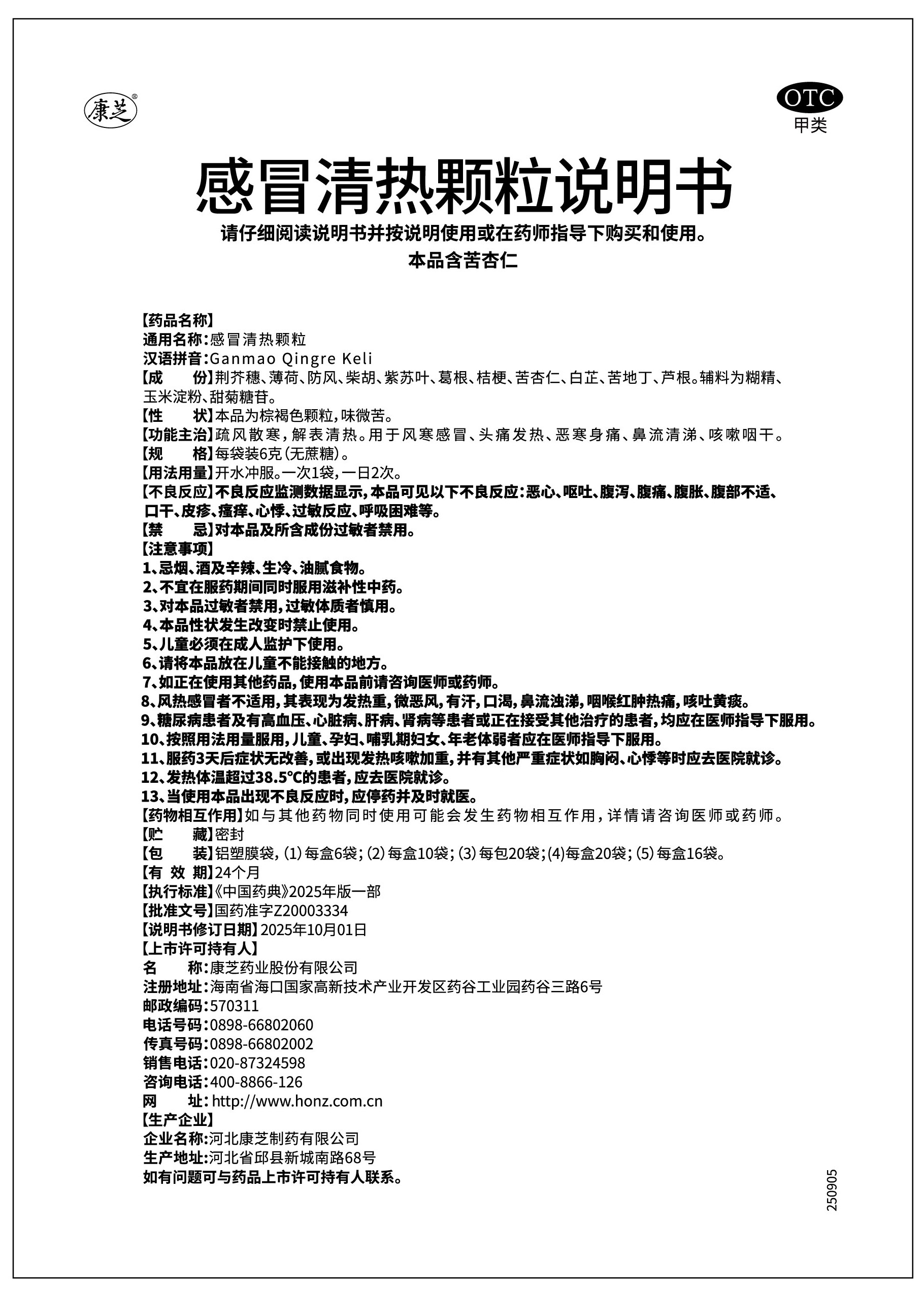 1.规格:6g*6袋,6g*16袋,6g*20袋; 2.功能主治:疏风散寒,解表清热。用于风寒感冒、头痛发热、恶寒身痛、鼻流清涕、咳嗽咽干。
